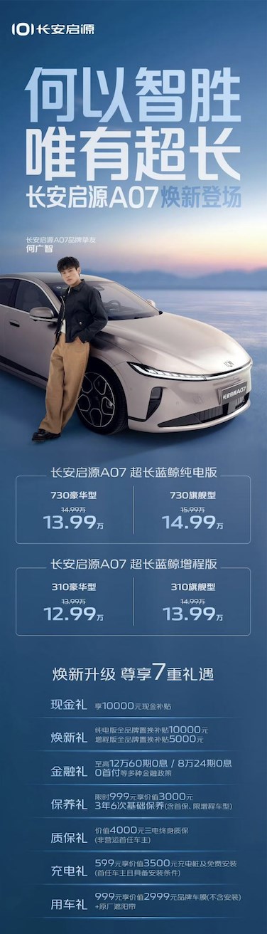9月10日,長安啟源A07超長藍(lán)鯨純電版/增程版煥新登場(chǎng),共推出4款車型,長安啟源A07超長藍(lán)鯨純電版 730豪華型、730旗艦型售價(jià)為13.99萬元、14.99萬元;長安啟源A07超長藍(lán)鯨增程版310豪華型、310旗艦型售價(jià)為12.99萬元、13.99萬元,并提供七重誠意大禮,全面滿足用戶對(duì)于越級(jí)價(jià)值的需求。